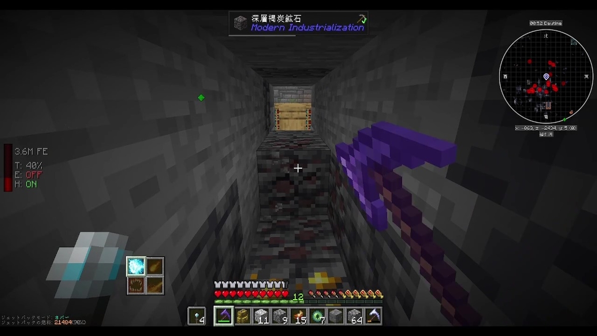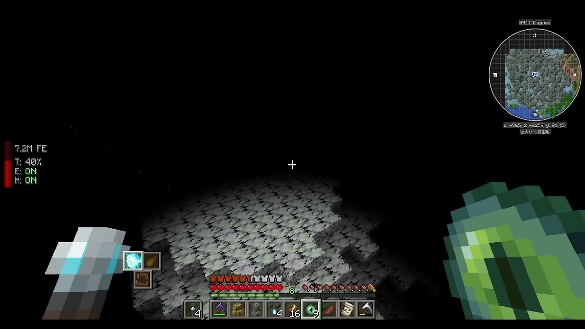 バイオームの影響なのか、50秒くらい暗闇デバフがついてしまいました。しかしながらエンド遺跡はこの辺りにありそう…。これ以上エンダーアイを投げられないのでここを掘っていきましょう。