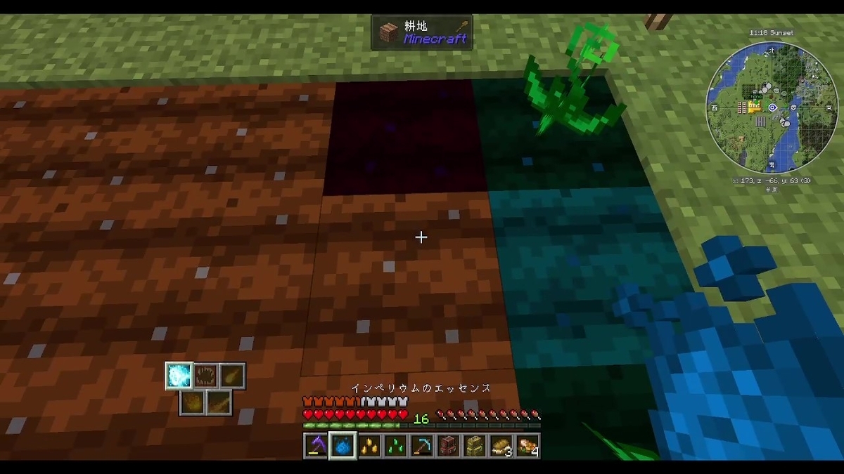 インフェリウムエッセンスを大量に得ることができたので、上位のインフェリウムエッセンスにして耕地を作ります。インフェリウムの種からの収穫量が増えるようです。土、クワとインフェリウムエッセンスをクラフトすることでも耕地を作れますが、耕地に直接エッセンスを右クリしても作れます。